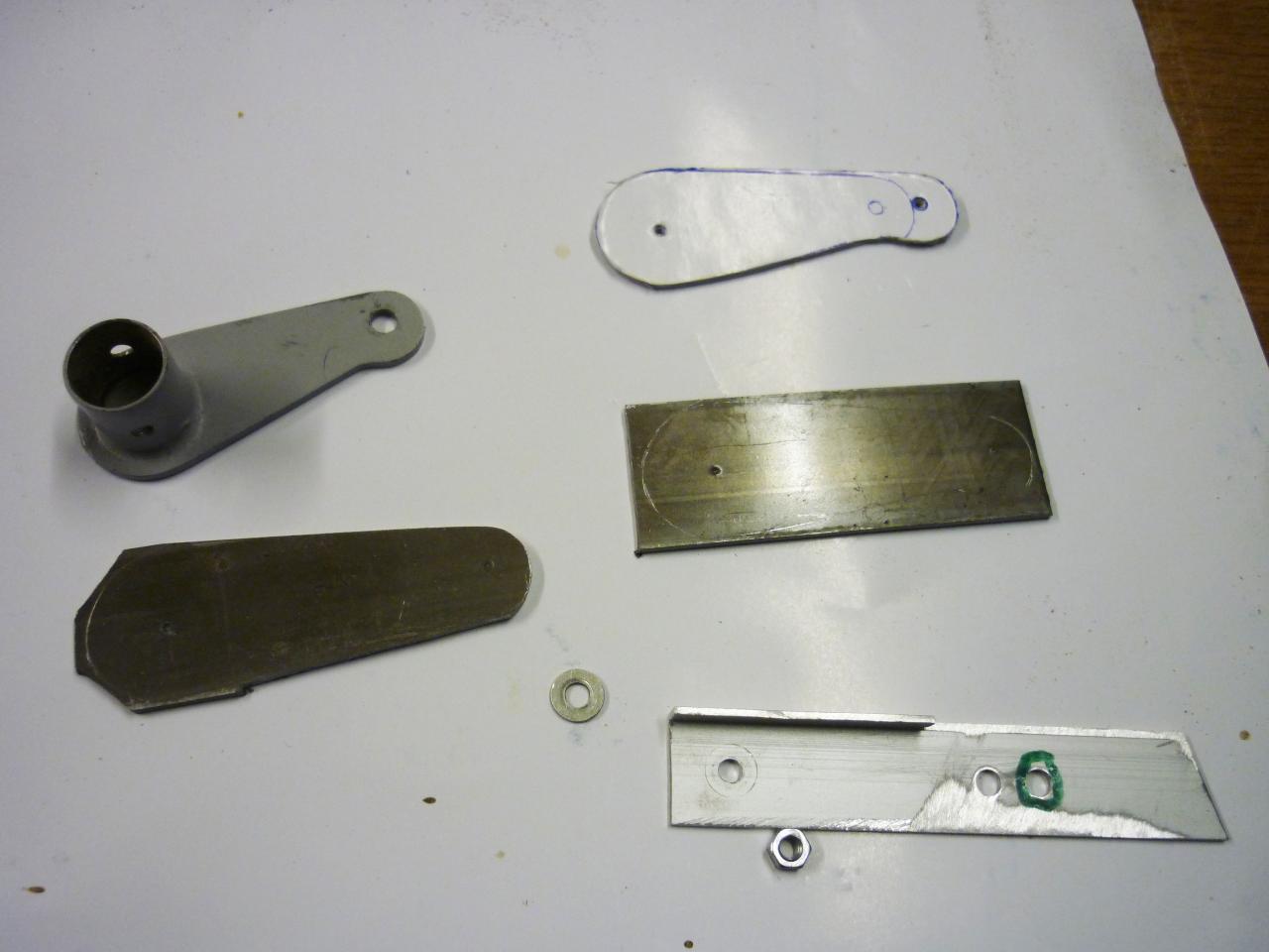 Après les tests de débattements des volets, nous avons constaté des angles de volets insuffisants. Décision a été prise d' allonger les guignols de commandes de ces derniers. Voir le gabarit en haut à droite de la photo.